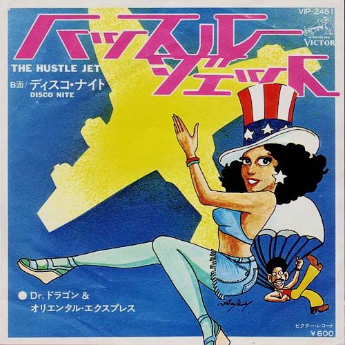 もひとつ京平ディスコから「ハッスル・ジェット」です。こちらもセクシーなブラック・ビューティにジェット機シルエット。深く考えるなよ、さぁ踊ろう!と言わんばかりの直球勝負が潔い。後ろの人がいい味出してくるのも好き。
