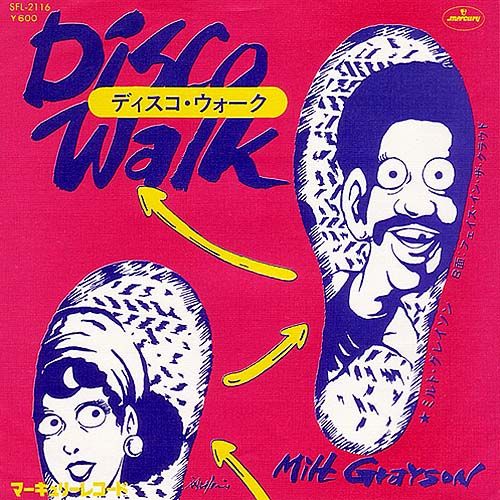 【7"】MILT GRAYSON / Disco Walk (Mercury)セッション・ヴォーカリストとして活躍していたミルト・グレイソンがマイケル・ゼーガーとのコンビで録音した76年のポップ・ディスコ名曲「ディスコ・ウォーク」。ステップ解説の足跡マークになってます。ようく見るとまつ毛でお目目パッチリ。