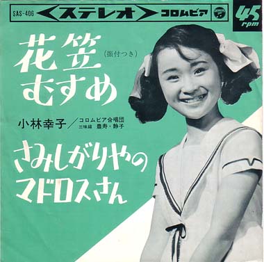 若ーッ!若いというより子供ですねまだ、ほんの。64年“ひばり二世”などと謳われ華々しくデビューした少女時代の小林幸子、レコードはあまり入りません。これは65年に発売された「花笠むすめ」で4枚目、11歳の頃のシングルです。その歌唱力は当時から折り紙つきで古賀政男先生も絶賛する逸材。幼さは勿論あるけれどもコロコロと回るコブシは現在を髣髴とさせ、歌手としての基盤が既に出来ていることに驚きますね。B面「さみしがりやのマドロスさん」では少し大人びて、去り行くマドロス男を見送る女の子を可愛らしく歌ってます。