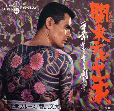 【7"】菅原文太/ 『関東テキヤ一家』主題歌 関東テキヤブルース (teichiku)「まだ玉は残っとるがよ」「1年半と7年か・・間尺に合わん仕事したのう・・・」やっぱ文太は渋い!『仁義なき戦い』シリーズで大スターの仲間入りをした彼が歌う'69年主演映画の主題歌。自ら作詞を担当、作曲はアニメの主題歌でも有名な菊地俊輔。文太にしか歌えん男のブルースやわ・・。しかしジャケに写るモンモン凄すぎ!「広島のケンカいうたらよ、殺るか殺られるかの二つしかありゃせんのじゃけぇ!」1500円