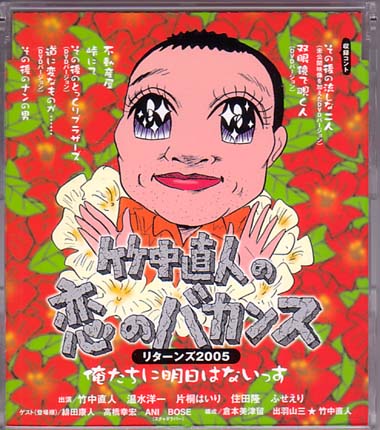 94~95年に放送されていた伝説の深夜シュール・コント番組「竹中直人の恋のバカンス」DVDボックスが入ってきましたー、オーチン・ハラショーーーー!!めちゃ好きでした。竹中直人を中心に、ビシバシステム(住田隆・ふせえり)や片桐はいり、温水洋一など超強烈なメンツが脇を固めてます。“ナンの男”に“とっくりブラザーズ”“5人の若大将”“ショスタコビッチ三郎太”…あー思い出すだけでワクワクする底抜けにくだらなく、底抜けに面白い名キャラ・名言・名コントの数々です。個性的なゲスト陣もポイント高い。高橋幸宏との“流しな二人”は最高でした!二人揃って流してま〜す。4枚組+2005年の新作コント「恋のバカンス・リターンズ2005〜俺たちに明日はないっす」を収録した非売品DVD(応募者特典)付です。美品 8980円