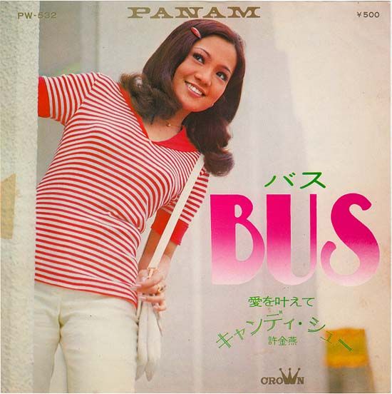 '69年に「遠く消えた恋」でデビューした台湾アイドル、キャンディー・シュー(許金燕)の'72年「BUS(バス)」7吋。作詞:千家和也、作・編曲:三木たかし。演歌寄りなのかなぁ〜なんて予想しつつ聴いてみると、いきなりパーカッション&ファズ・ギター炸裂のやさぐれソウル歌謡してたのでもうビックリ!とにかく濃厚です。欧陽菲菲路線なんでしょうが、こちらのほうが迫力より色気を感じます。