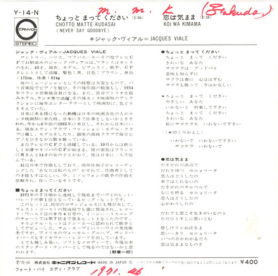 【7"】ジャック・ヴィアル/ ちょっとまってください (canyon)