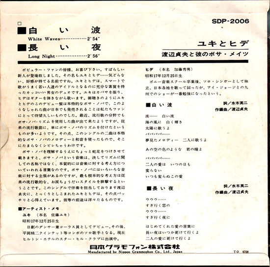 ヒデとロザンナの出門英が佐藤ユキ(後のアン真理子)と組んだデュオ:ユキとヒデの'67年作「白い波」7吋盤です。本場帰りの渡辺貞夫による本格的ボサノバ。アストラッド・ジルベルトもカタコト日本語で歌ってましたな。