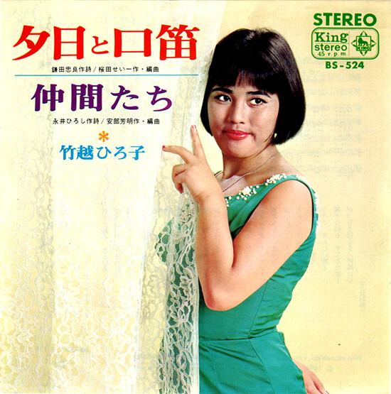 力道山に見出された元ジャズ歌手 from 大阪…竹越ひろ子の’65年作「夕日と口笛」7吋盤です。そのB面「仲間たち」が凄いのだ。