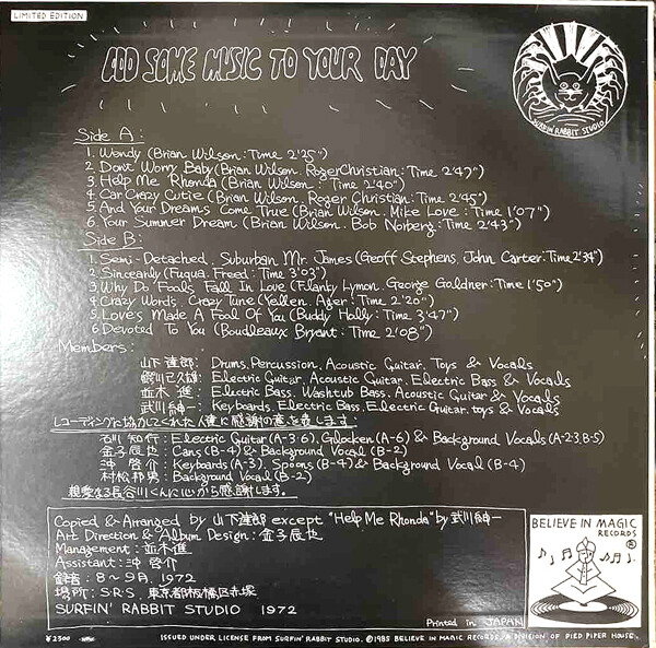 シュガーベイブ以前に友人たちと自主制作(わずか100枚プレス)したアルバム『ADD SOME MUSIC TO YOUR DAY』LPです。演奏・録音技術などはまだまだという感じですが(当たり前)、実のなる木は花から知れるってヤツですね。これを知ってこそシュガーベイブ、ナイアガラ、その後のニューミュージックの旗手期をより深く理解できるわけであります。