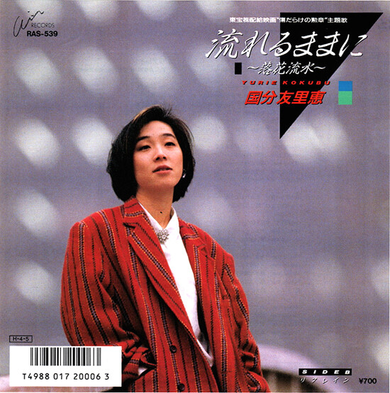 国分友里恵の'86年作「流れるままに〜落花流水〜」7吋盤です。西城秀樹主演映画『傷だらけの勲章』主題歌、作詞:青木久美子、作・編曲:林哲司。