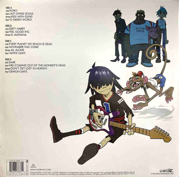 ブラーのデーモン・アルバーンとコミック作家ジェイミー・ヒューレットらによる覆面プロジェクト:ゴリラズの2nd『DEMON DAYS』LPです(2005年)。デ・ラ・ソウルやネナ・チェリーが参加、i-podのCMソング「FEEL GOOD INC」収録でお馴染みですな。エレクトロ・トリップ・ホップの体裁ながら脳裏に染み付くメロディーとサウンド、コンセプチュアルな構成!彼らの最高作はこのアルバムをおいて他にありません。