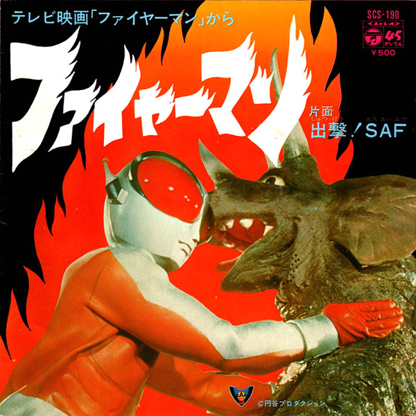 円谷プロ10周年記念特撮『ファイヤーマン』の主題歌7吋盤です。作詞:阿久悠、作曲:小林亜星、編曲:ボブ佐久間。スリル溢れるサウンドに子門真人のクリアで熱い歌声が弾ける!