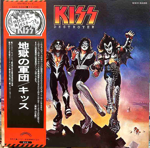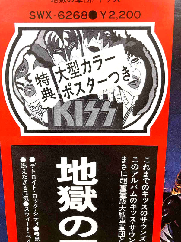 キッスの'76年作『地獄の軍団』LPです。「デトロイト・ロック・シティ」や「狂気の叫び」等、彼らの代表曲を多数収録していることもあり大ヒットしたアルバムですが、国内初板はポスターが付いておりました。これが滅多に残ってないのですが‥付いてたっす🙌