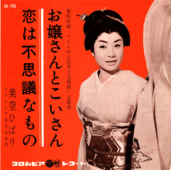 東映映画『べらんめえ芸者と大阪娘』主題歌、美空ひばりの「お嬢さんとこいさん」7吋盤です('62年)。作詞・作曲:米山正夫、編曲:福田正。「いややわ うち どないしましょう」「あらいやだ どうしましょう」‥つい最近もどこかで観ましたね、東京 vs 関西。