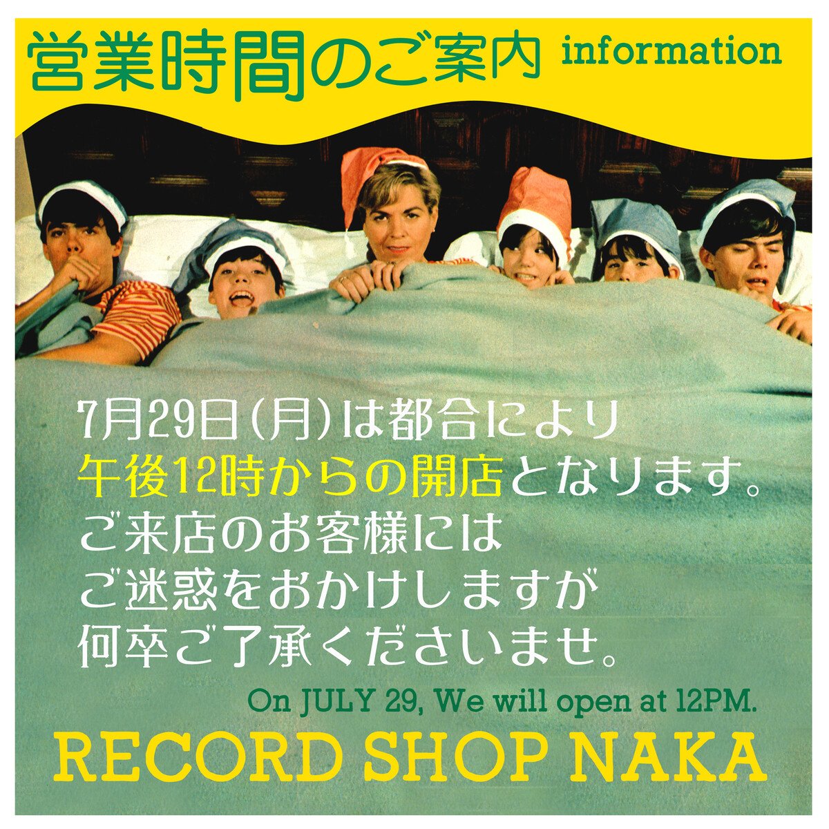 ÌÀÆü7·î29Æü(·î)¤ÏÅÔ¹ç¤Ë¤è¤ê¸á¸å12»þ¤«¤é¤Î³«Å¹¤È¤Ê¤ê¤Þ¤¹¡£